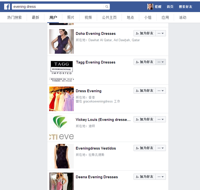 首先我们登录Facebook主页,然后把你想搜索的产品名称输入进去,然后点击热门搜索,比如我搜evening dress,下面会出现很多好多卖evening dress的,然后可以随便找一个人点进去。