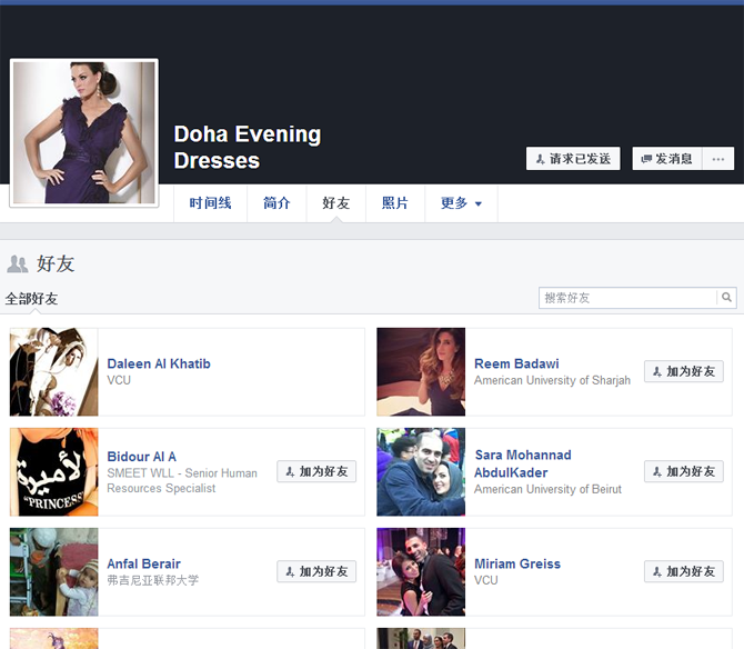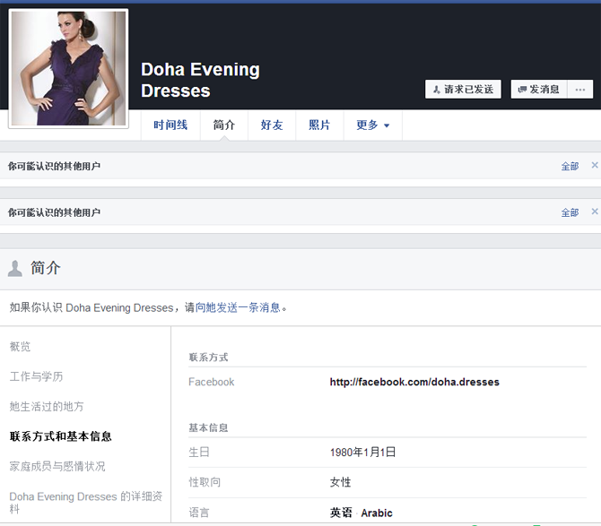 我随便点第一个人进去,可以先看简介了解下这个人,看完之后可以大致了解一点信息,一般来说可以看到的信息不是很多。可以看到联系方式和基本信息或者网站,如果有网站可以点一下网站,就可以进网站了。进入网站,也可以了解到更多的信息。这时如果判断是你的潜在客户的话,我们可以加她为好友。不过注意在facebook上加好友一天最好不要超过二十个,如果太多你的账号会面临着被封的风险。