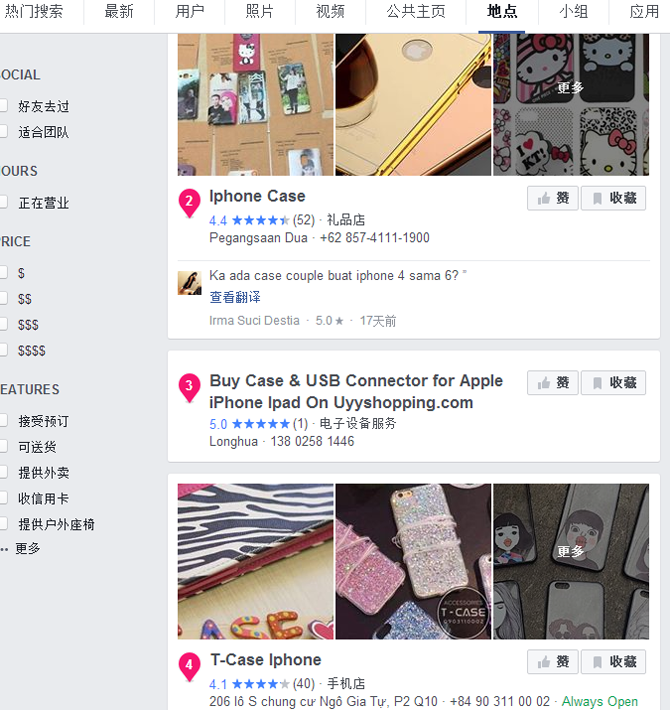 前面两个部分分享了如果通过Facebook上的热门搜索和公共主页找客户,现在跟大家分享如何通过Facebook上的地点来寻找客户,我以iphone case 为例。同样的输入iphone case 点击地点会出来很多数据。