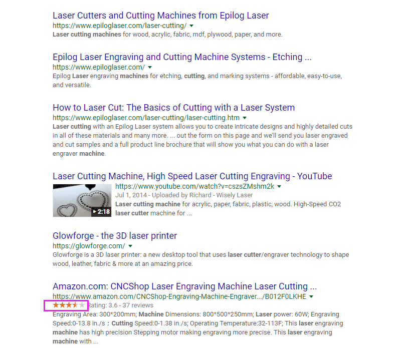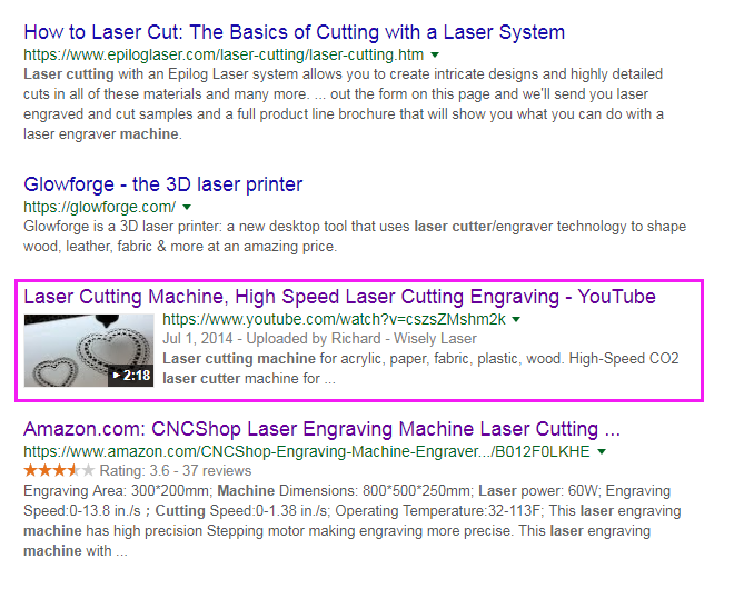 但是视频的好处不仅仅在于Youtube站内的流量,还在于同时也提升了在Google的排名。还是以“laser cutting machine”为例,这2分多钟的Youtube视频,让他跻身到了Google首页,且还是一个非常重要的主关键词。并且考虑到Youtube的股权是Google的,这个搜索结果还在增加中。