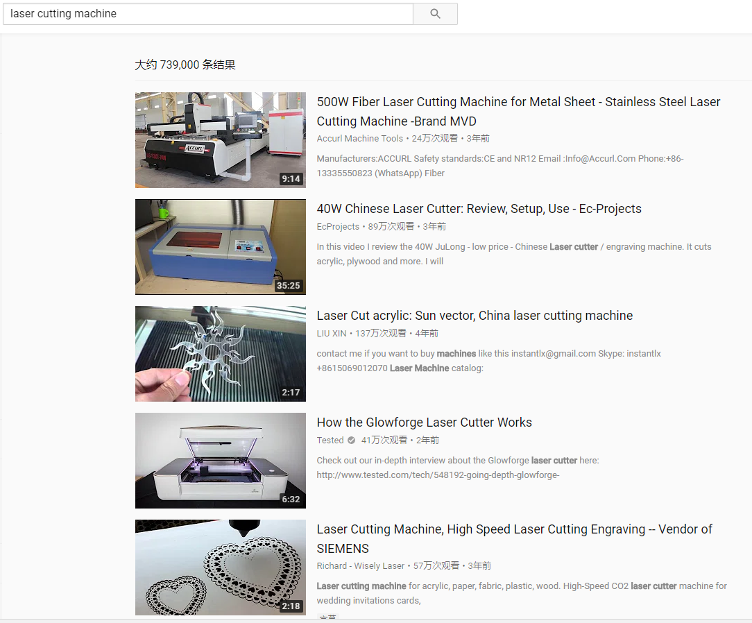 比如我们在Youtube上搜索“laser cutting machine”