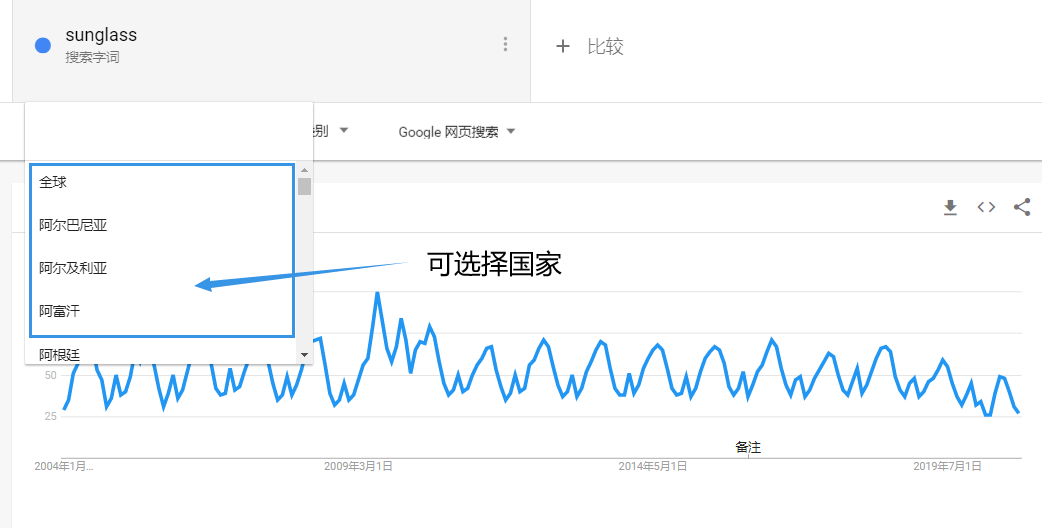 以“sunglass”这款产品举例,进入Google trends, 输入关键词,选择搜索字词。可以看到全球以及各个国家从2004年至今以来的搜索热度表现。