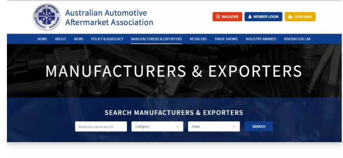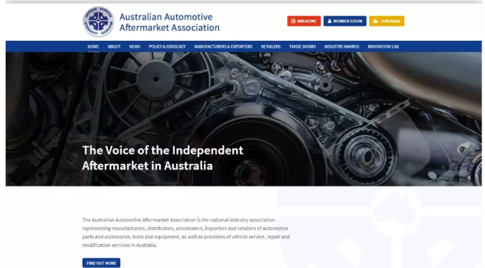 Betty是在宁波做汽车配件产品出口,主攻澳大利亚市场,学习了Google搜索开发客户的方法后,她找到了澳大利亚汽车售后市场行业协会网站:https://www.aaaa.com.au/,如下图所示: