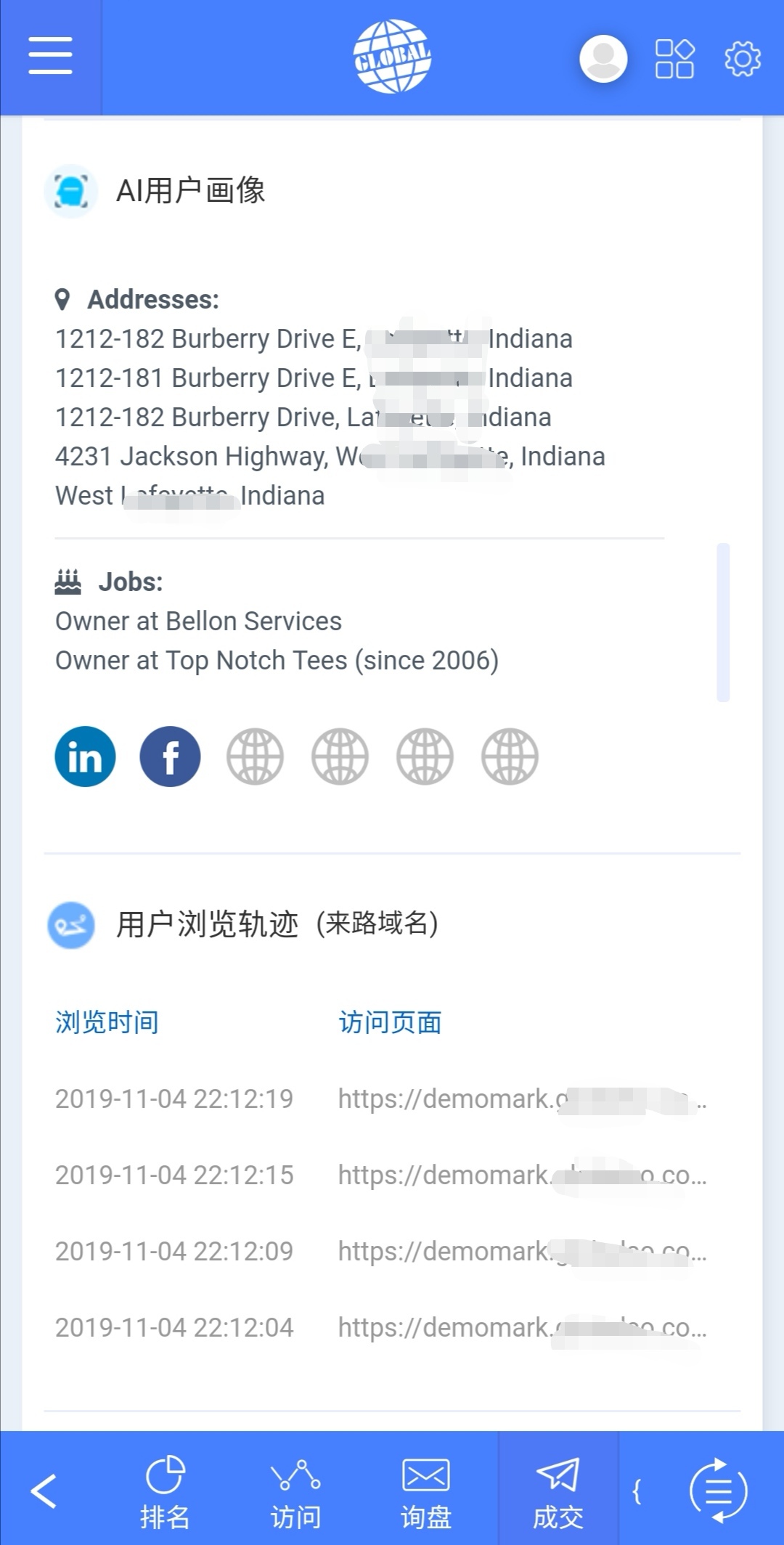 一键就能获取到客户的电话社交等信息,业务自动送上门,还可以实时把握询盘客户信息,全方位跟踪客户,即使了解客户需求,想客户所想。