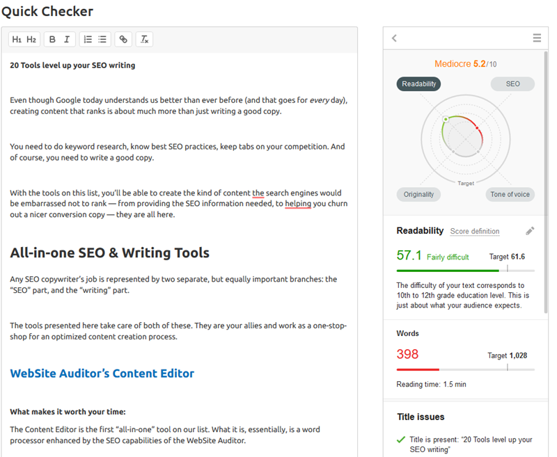 而且始终有一个关键字计数器,可以检查是否已添加所有目标关键字。撰写的页面也会不断地被审核,以查找页面上的SEO问题,并且提供被忽略的问题以及解决这些问题的最佳方法。当然,该工具也是免费使用的。