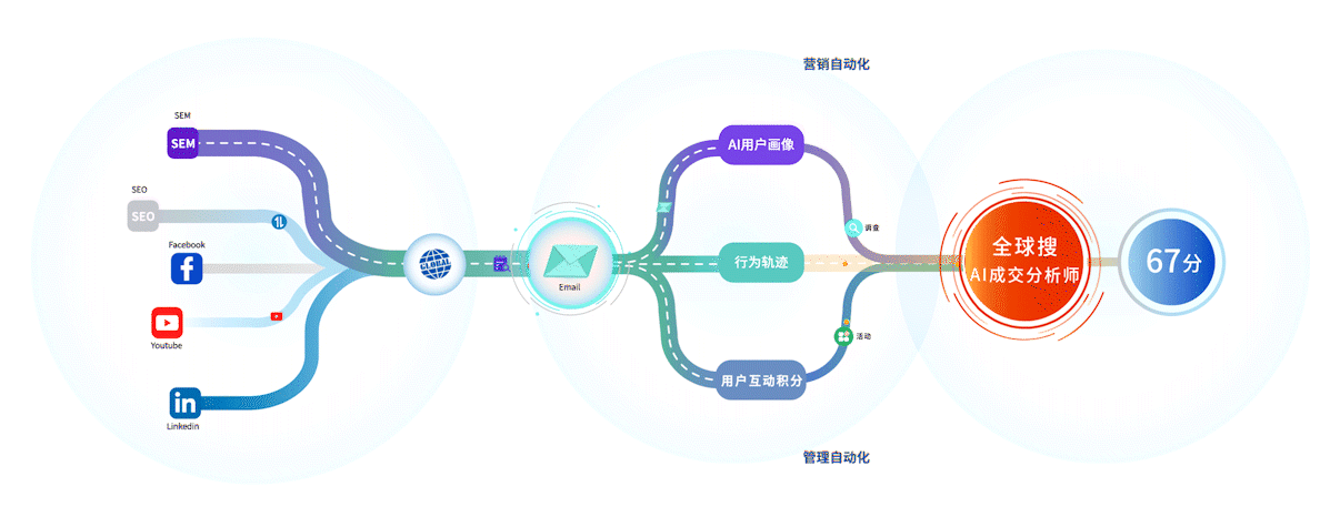 而全球搜AI智能营销系统,能追踪采购商的线上互动行为,利用人工智能大数据,对成交意愿进行智能打分,帮助外贸人员在最短的时间追踪到最重要的订单。