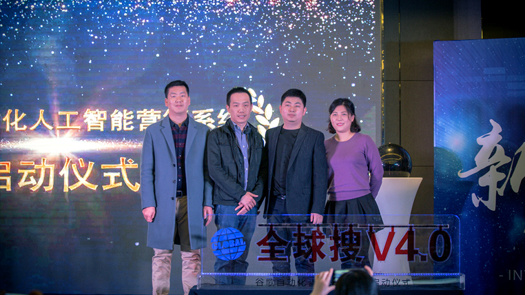 会议开启的第二项重要启动仪式——谷歌自动化人工智能营销系统的启动仪式。Google大中华区华南区渠道部高级经理Philex在致辞中强调,谷歌自动化和人工智能将是未来的一个很重要的方向,同时也会加大对全球搜系统的技术支持,随着Google大中华区的Philex与谷道科技CEO蒲竞超、深圳分公司任涛、江蓓将手中的红酒掺入水晶台,全球搜三个字的点亮标志着全球搜与谷歌的深度合作进入新的里程碑。