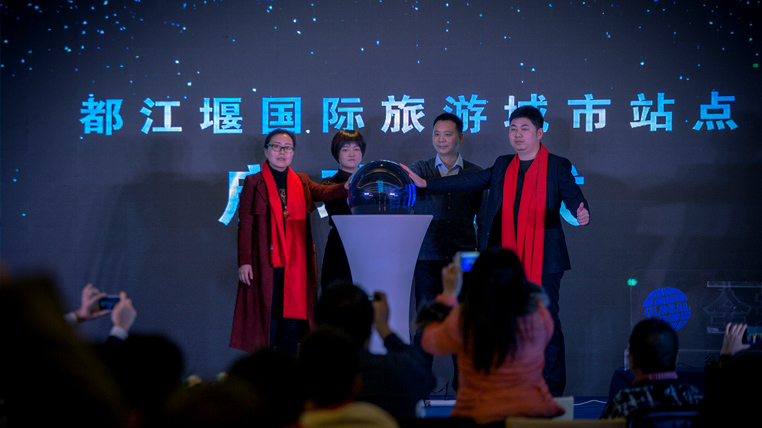 随后会议开启第一项重要启动仪式——都江堰国际旅游城市站点启动仪式。随着市委常委王志海、商务局艾曦局长、团市委肖瑶书记与谷道科技CEO蒲竞超触摸显示屏手印共同开启这历史性的一刻,标志着都江堰市政府与谷道科技正式开启合作,采用全球搜系统通过国际互联网打造都江堰市国际旅游品牌。